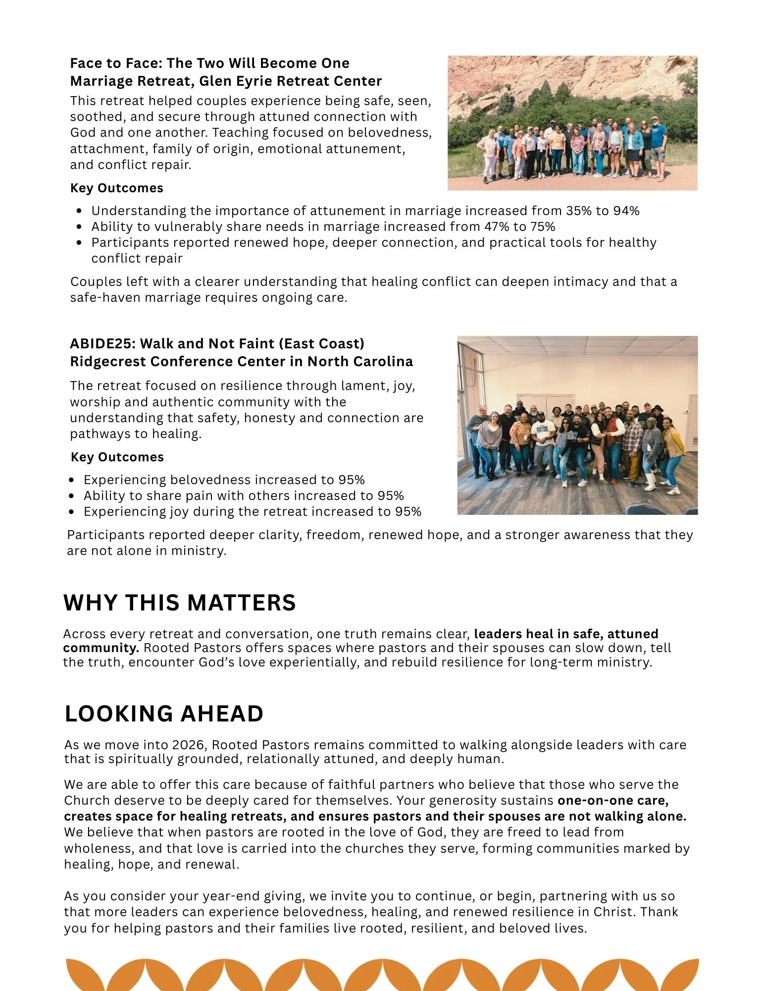 We currently host 1-2 multi-day retreats every year and invite pastors from all over the country. Many of our clients do not have the financial resources to cover registration costs and travel, so our hope is to cover as much as we can on a case by case basis. Your donations to this fund are tax-deductible and will be earmarked specifically for scholarship requests.